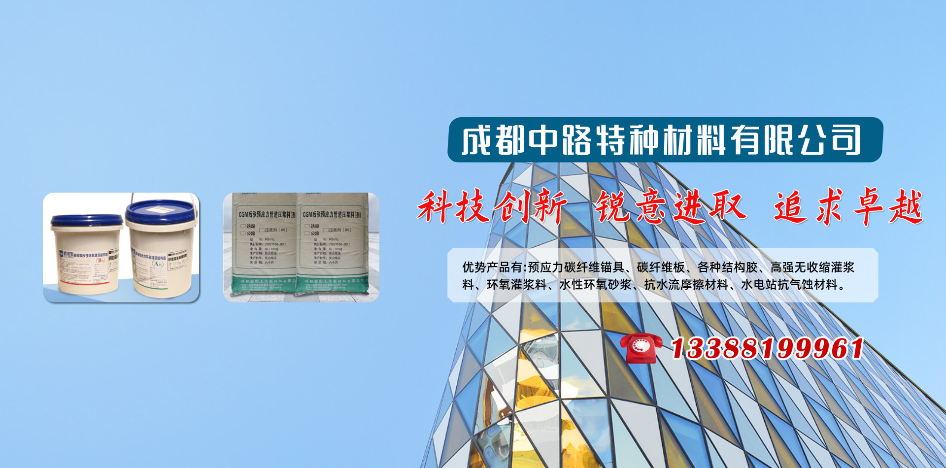 成都中路特種材料有限公司借助清華大學高分子材料學科、晨光化工研究院、西南交通大學、四川交通職業技術學院科研技術平臺成為一家集新材料研發、銷售、技術服務和施工于一體的專業服務公司,優勢產品有:預應力碳纖維錨具、碳纖維板、各種結構膠、高強無收縮灌漿料、環氧灌漿料、水性環氧砂漿、抗水流摩擦材料、水電站抗氣蝕材料和研發各種特殊用途膠黏劑產品地處西南腹地成都,業務覆蓋四川各大中小城市、重慶、云南、昆明、新疆、西藏等區域。產品涵蓋各種加固施工材料、施工設備及施工配件,品牌有威士邦等aa進口品牌,同時批發銷售國產高、中、低端品牌,為客戶提供全面參考。 成都中路特種材料有限公司為您提供加固行業的一站式服務! 如果您面對建筑物加固,不知如何下手,我們將針對您的項目情況,提供全面的技術指導咨詢,甚至為您量身定做加固方案;如果您面對項目要求,不知如何購買加固材料,我們將根據您的需要,提供多種參考,從進口品牌、國內知名品牌到低端產品,一應俱全; 如果你萬事俱備,不知何處尋找施工人員,我們可以為您提供具有多年加固經驗的專業隊伍;中路特種材料致力于為客戶提供全方位的建筑物加固解決方案。 成都中路特種材料有限公司是一座橋,一座連接廠家與用戶的橋,以質量求生存,以信譽圖發展,成都中路特種材料有限公司期望用真摯的服務筑起一座客戶信任之橋。   科技創新 銳意進取 追求卓越!        熱忱歡迎業內專業人士加盟合作!